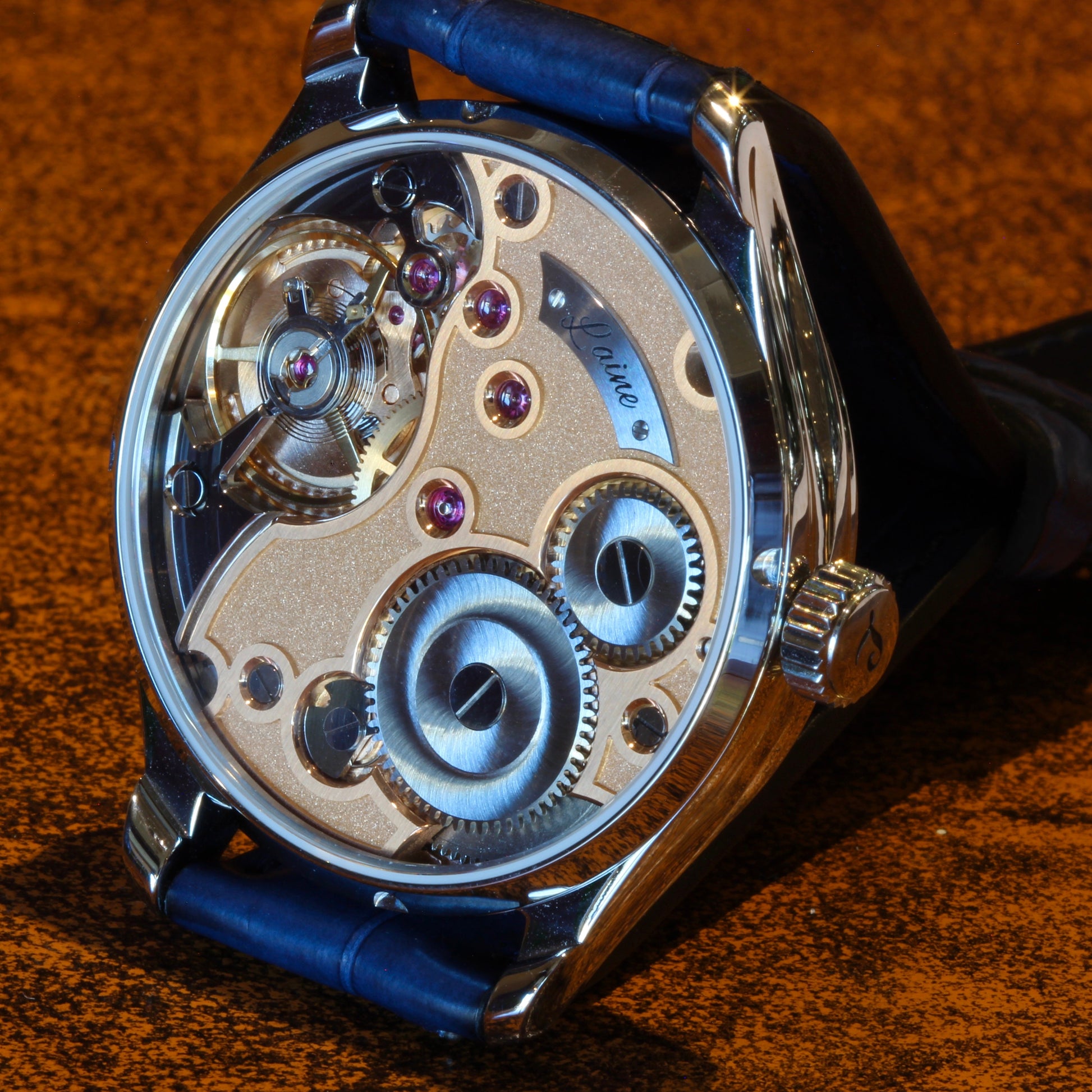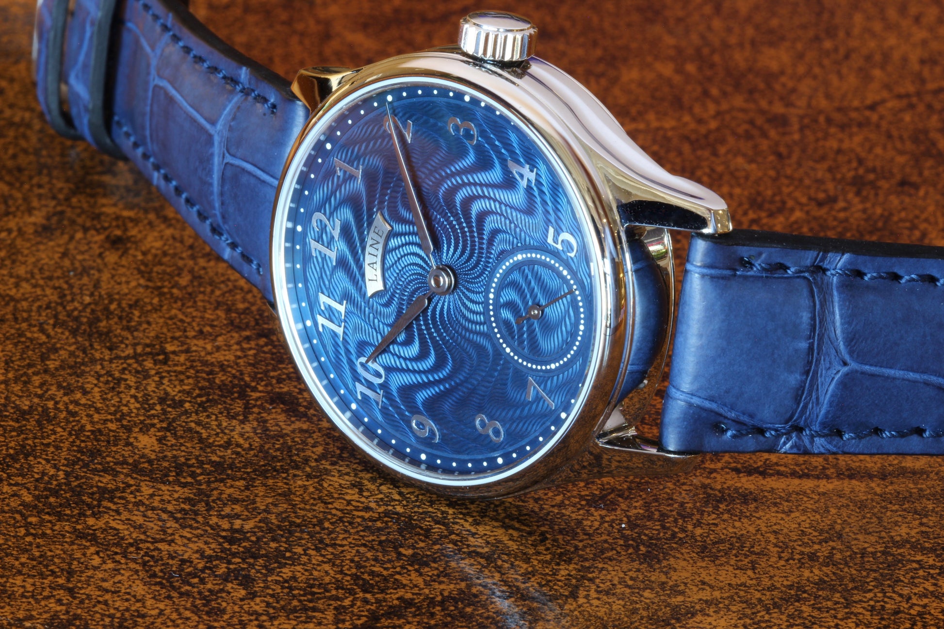 Torsti's 2nd official release. After the original Gelidus, with the heavily hand finished caliber, and now featuring a black polished and bevelled balance wheel cock and escape wheel cock, this new dial execution is stunning! Colored lacquer over the hand guilloche! Using a frosted finish on the mainplate with polished jewel sinks, it is an example of his vast talent. The new Guilloche dials are all done by hand on a rose engine machine and have a lovely depth to them, with blue, purple, green & grey coloring on offer. 3 colors are available for the main plate, YG, RG or Rhodium together with arabics or romans for the numerals.
